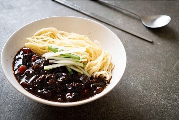 Mi dengan balutan pasta chunjang (pasta kedelai hitam) ini populer sebagai comfort food praktis dan cepat disajikan. Menu jjajangmyeon ini merupakan salah satu hidangan andalan di restoran atau kedai masakan Korea-Cina.